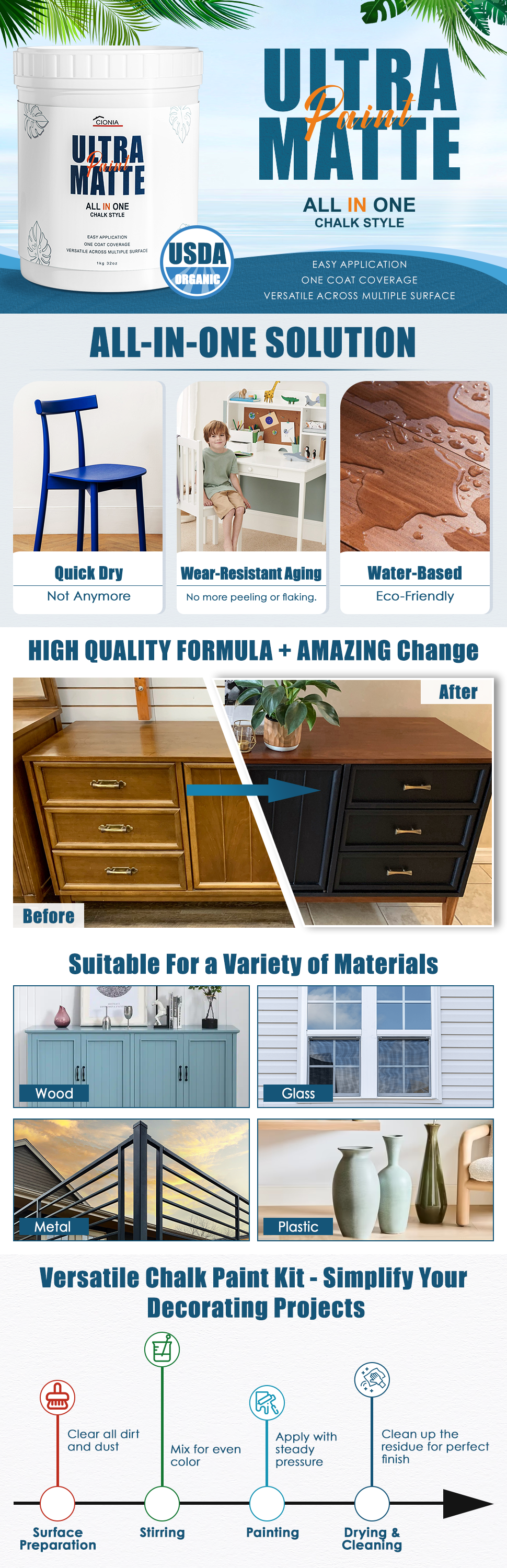 - Unique water-based formula; Compared with traditional paint, our water-based furniture paint has little odor, no long-time ventilation is required.
