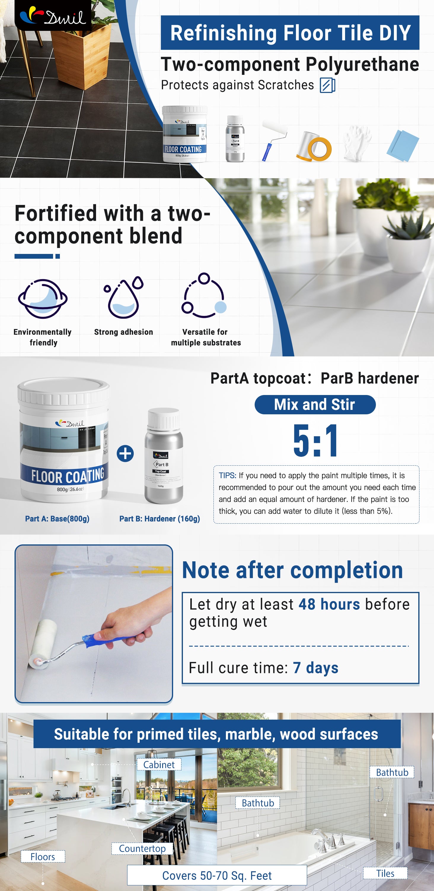 - Floor coating (Part A1: 1kg /35oz+Part B1:20g/0.7oz) covers 40-50 sq. ft. for 2 light coats; For better result, two coats are recommended. Clear topcoat (Part A2:400g/14oz+ Part B2:80g/2.8oz) covers 40-50 sq. ft. for 1 coat.