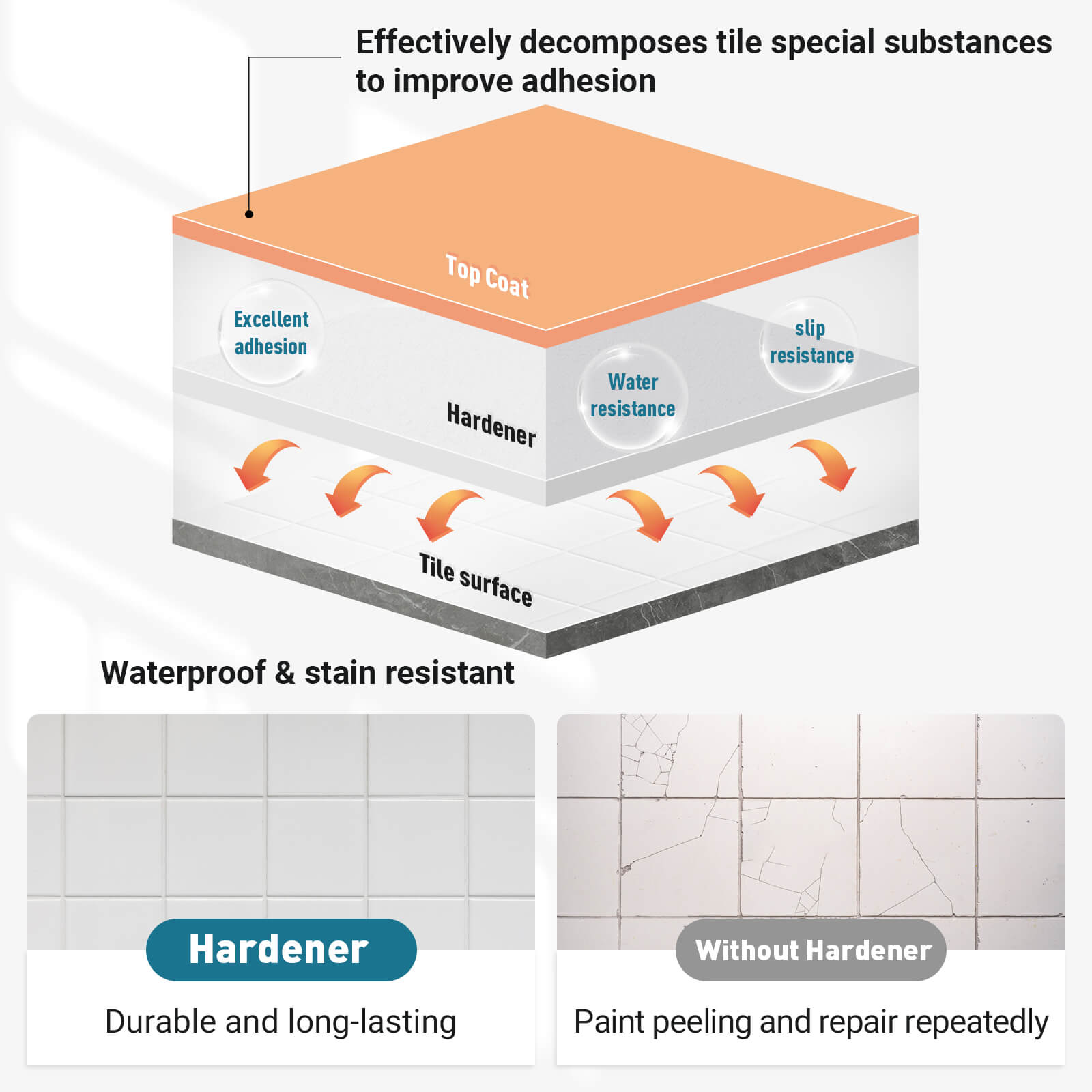 - 5X stronger than one-component material. The floor paint and the seal topcoat are both made of high performance two-components material. Unlike walls, floor tile go through a lot. The two-components product will last much longer than a requalar one-component product.