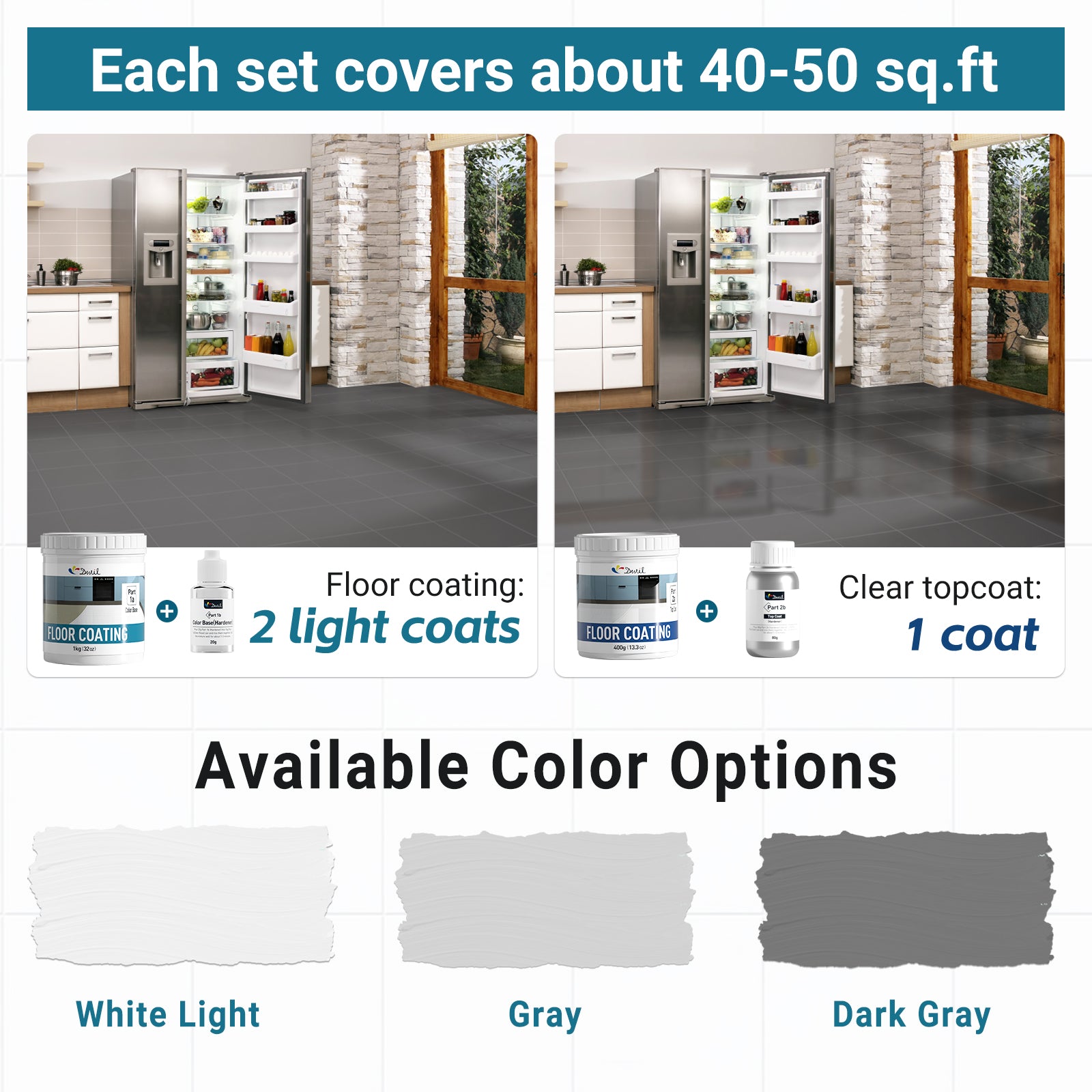 - Floor coating (Part A1: 1kg /35oz+Part B1:20g/0.7oz) covers 40-50 sq. ft. for 2 light coats; For better result, two coats are recommended. Clear topcoat (Part A2:400g/14oz+ Part B2:80g/2.8oz) covers 40-50 sq. ft. for 1 coat.