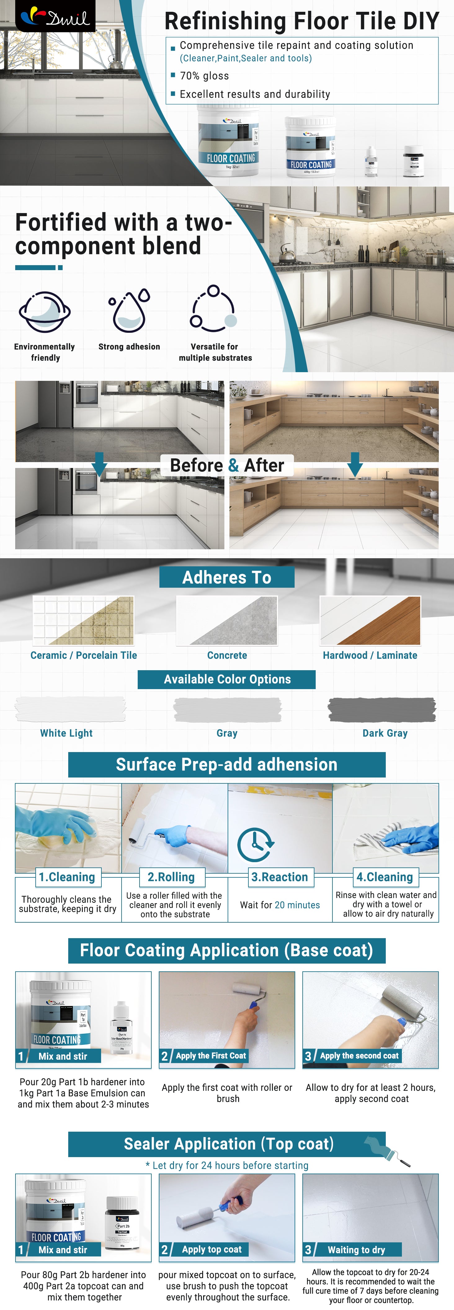 DWIL 地板涂料套装是一款简单的两步系统涂料,旨在提供卓越的附着力、防水性、防滑性和耐用性,可用于翻新旧瓷砖,使其焕然一新。如果您正在寻找这类涂料,DWIL 是您的最佳选择。