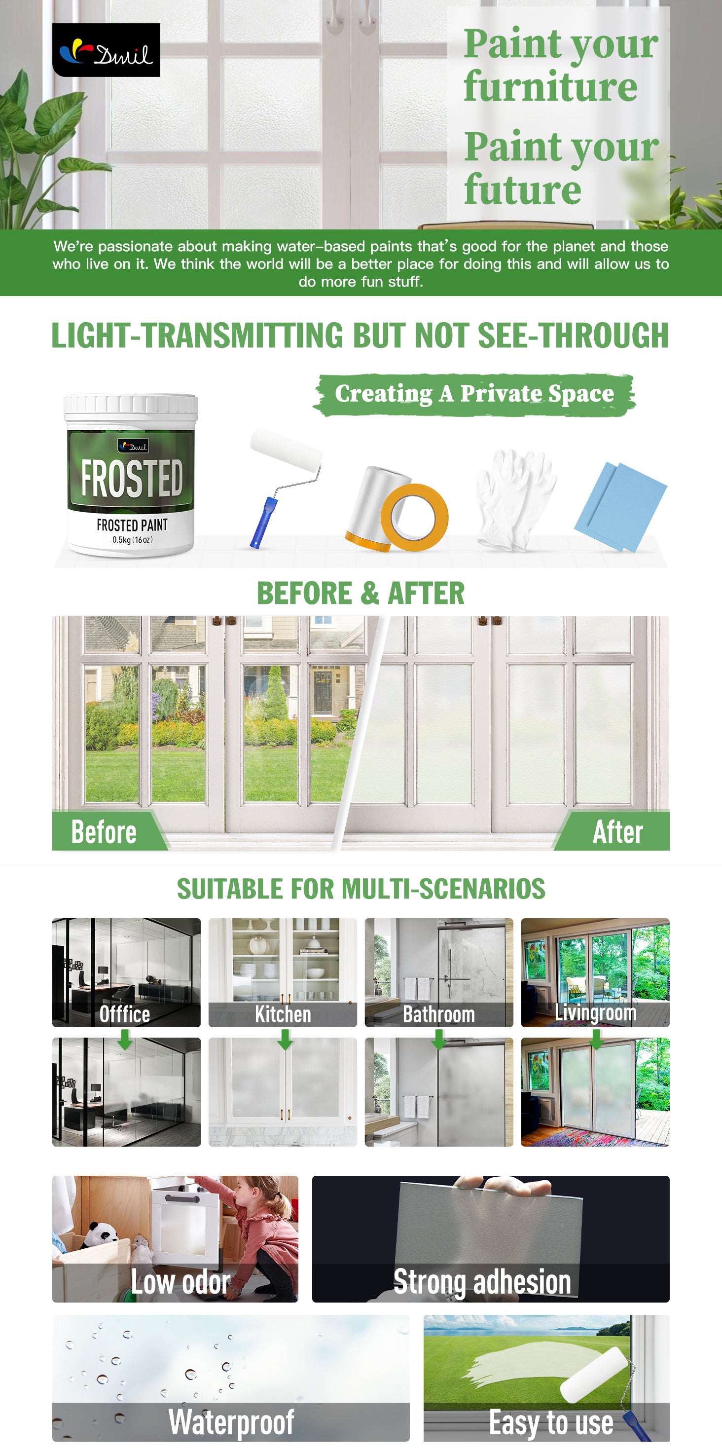 - Low odor - DWIL frosted glass paint is water-based paint with the characteristics of low odor and low VOC.