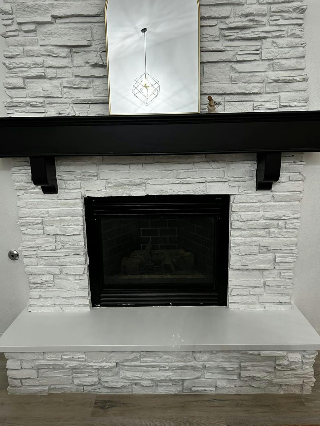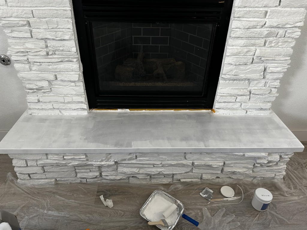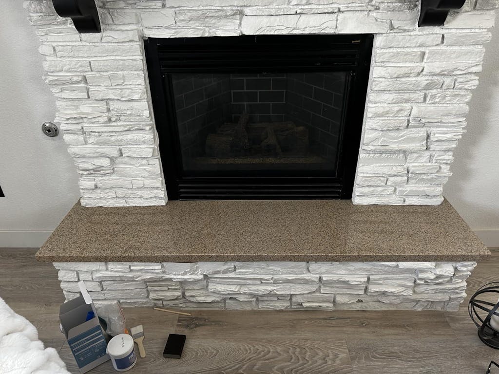 We just moved into a new house recently and we had the stone fireplace painted, but I wanted to paint the granite slab myself.This is before; after first application; and after final application. I had to do 4 applications, but I also applied it pretty thin each time. Because my applications were thin I was able to apply the next coat within a hour/hour & a half.