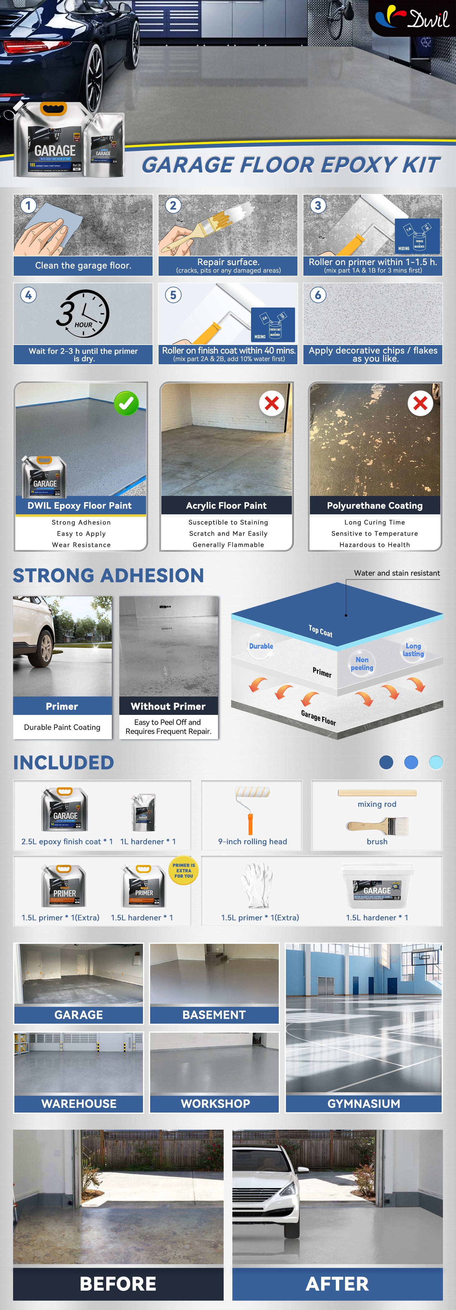 - 【Extra Primer Included】In addition to the water-based garage epoxy floor paint, we include an extra primer for you. The primer enhances adhesion, making the coating more durable and long-lasting. This extra step in the application process makes all the difference, giving you a floor that stands up to wear and tear over time.