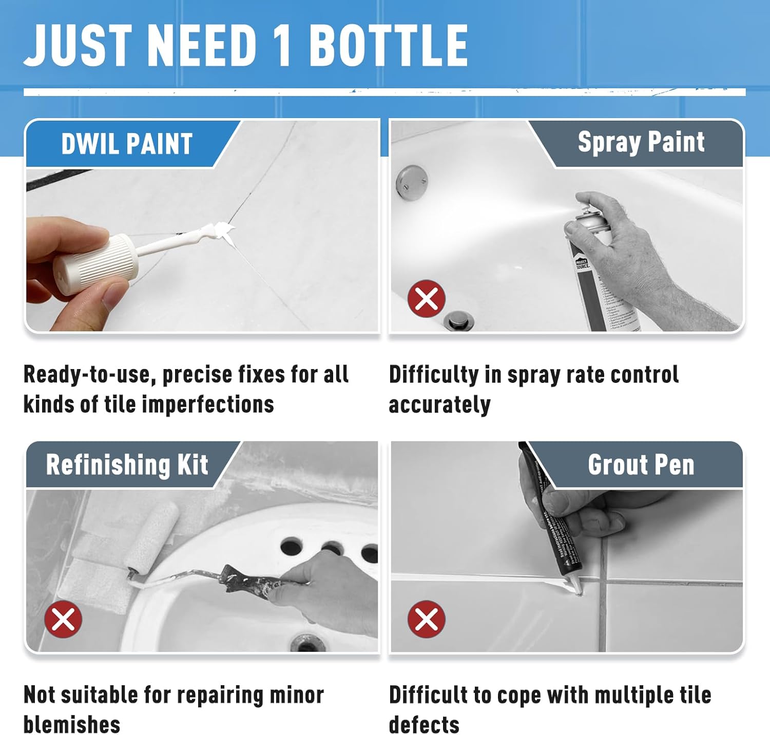- High Durable - DWIL white paint is formulated with high quality acrylic resin to adhere firmly to tile surfaces, preventing flaking or chipping. It is waterproof and long-lasting, quick drying and durable, effectively covering and repairing imperfections on surfaces.